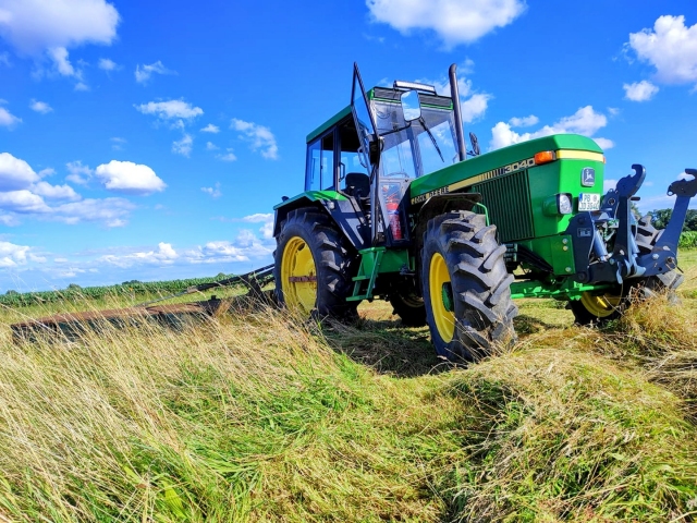 Et sommerbillede af vores kunde fra Tyskland, som har installeret vores universelle forhåndshydraulik på deres John Deere 3040. Med forhåndshydraulik øger vi bestemt effektiviteten af arbejdet med traktoren.