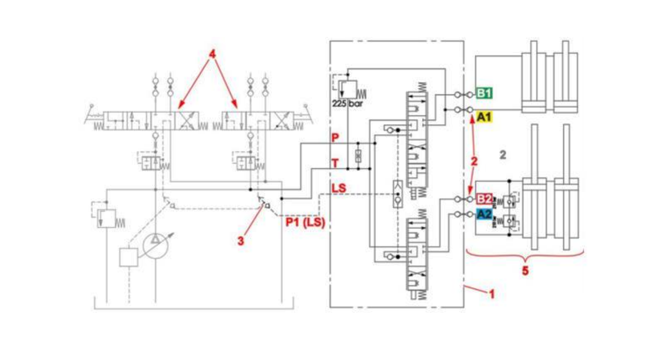 De afbeelding toont een LOAD SENSING hydraulisch systeem: